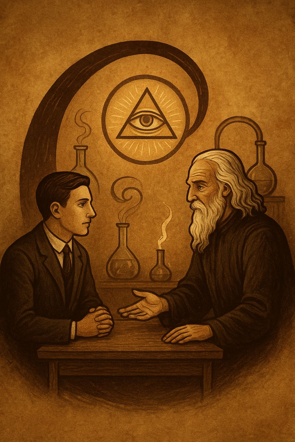 Eu tinha, a respeito da alquimia e dos alquimistas, ideias primárias, extraídas da imaginação popular, e estava longe de supor que ainda havia alquimistas. O homem que estava sentado na minha frente, na mesa de Voltaire, era jovem e elegante. Fizera profundos estudos clássicos, seguidos de estudos de química. Actualmente ganhava a vida no comércio e dava-se com muitos artistas, assim como com algumas pessoas da alta sociedade.