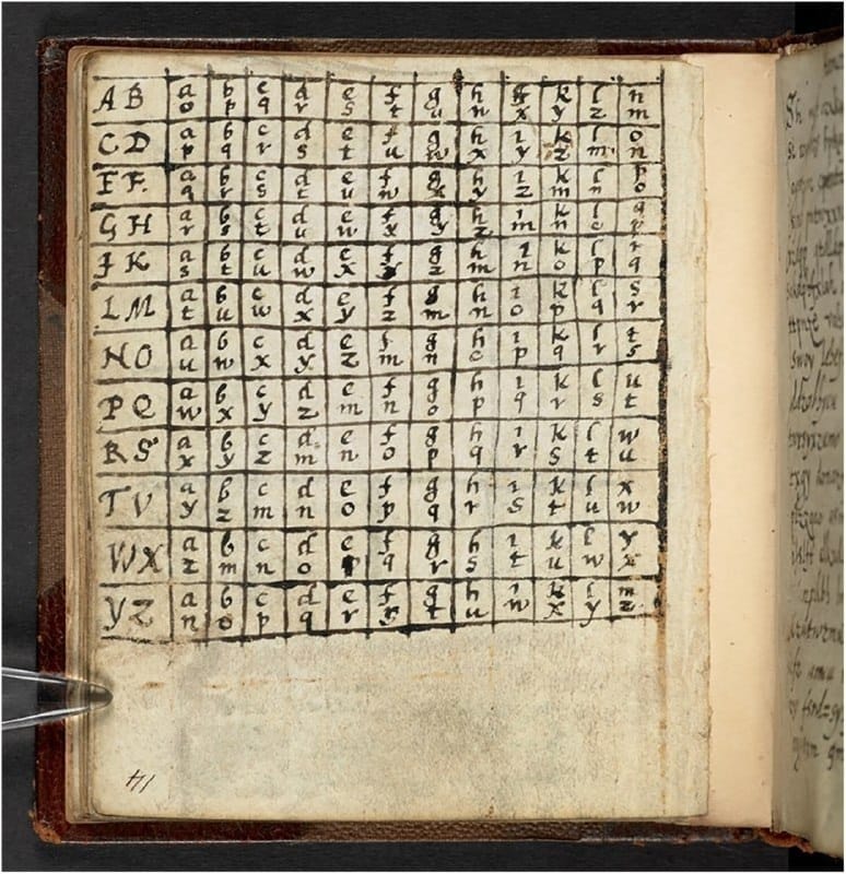 Nota Histórica: A tabela de Arthur Dee é adaptada para incluir as letras ‘k’ e ‘w’ (necessárias em inglês), embora o texto cifrado fosse em latim. Além disso, a tabela original continha erros que a tornavam inútil para a decifração manual até ser corrigida.