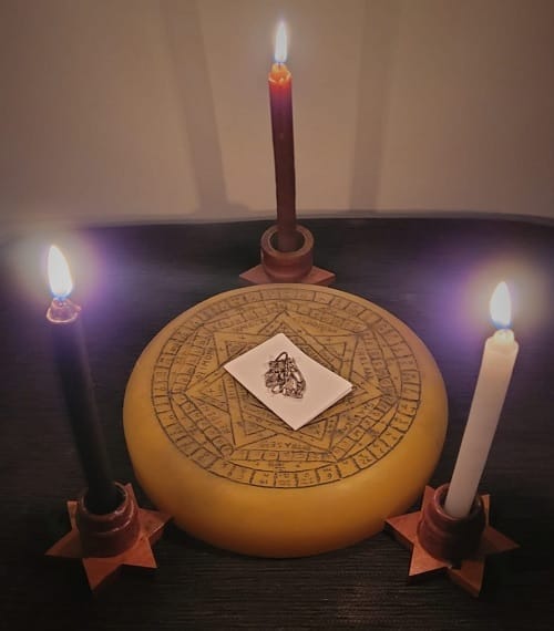 Para ficar claro, recolocamos o ‘Sigillum Dei Aemeth’ no lugar do ‘Símbolo de Baphomet’ e substituímos a Invocação à Satã e os Nomes Infernais pela Obediência Fundamental de John Dee e os Nomes de Deus dos quadrantes da Grande Tábua. Contudo, foi mantido o roteiro e a mecânica da feitiçaria com ênfase no Desejo e no Vinculo Material. Foi mantida também a lógica dos três tipos de rituais “Luxúria”, “Destruição” e “Compaixão” pois estes bastam para quase todos os objetivos taumatúrgicos.
