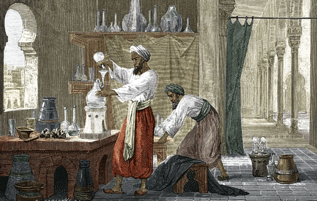 A alquimia, como ficou conhecida no final da Idade Média e no Renascimento na Europa, é claramente uma influência sentida diretamente do mundo muçulmano. A própria palavra é derivada do árabe al-kimiyâ, “a arte da transmutação”. Ela foi tomada emprestada para o árabe do grego χημεια (khêmeia), “a arte (egípcia) da transmutação”. A arte foi atribuída ao Egito, embora a maioria das evidências do que ficou conhecido como alquimia seja derivada de fontes gregas geradas em Alexandria e Harran, um lugar no Oriente para o qual os filósofos pagãos da Grécia fugiram quando os cristãos fecharam suas escolas.